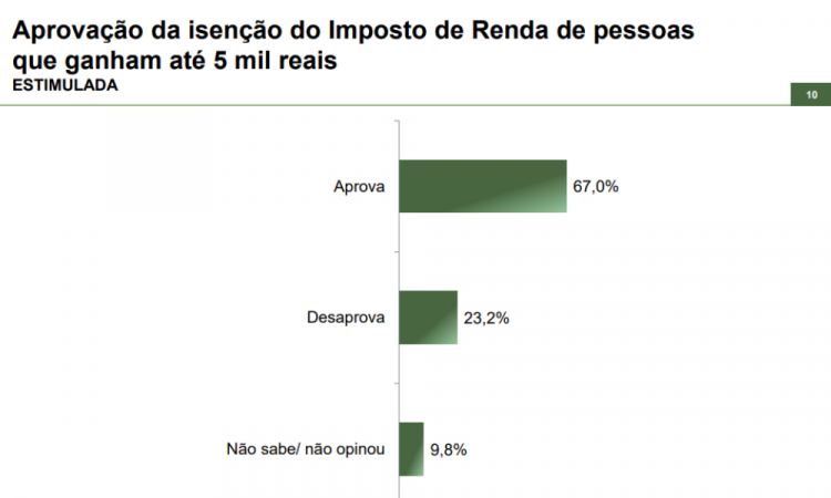 O levantamento apontou que até aquele momento 39,2% dos participantes ainda não tinham conhecimento sobre a medida anunciada pelo governo, enquanto 60,8% afirmaram estar cientes sobre a mudança. Considerando a resposta dos entrevistados diante da proposta, 67% da população aprovou a medida. Por outro lado, 23,2% desprovaram a isenção do IR para quem ganha até 5 mil reais, enquanto 9,8% preferiram não opinar ou não souberam responder.