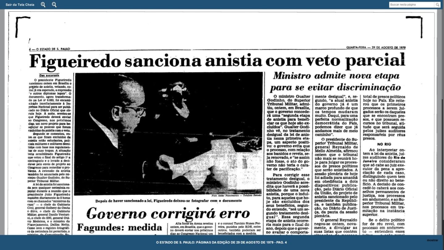 A anistia ampla, geral e irrestrita aos presos políticos, que parece um tabu para os atuais donos do poder, foi sancionada pelo então presidente João Figueiredo em agosto de 1979. Segundo o jornal O Estado de S. Paulo do dia 29, “o documento, agora transformado na Lei número 6.683, foi encaminhado imediatamente à Imprensa Nacional para ser publicado no Diário Oficial.