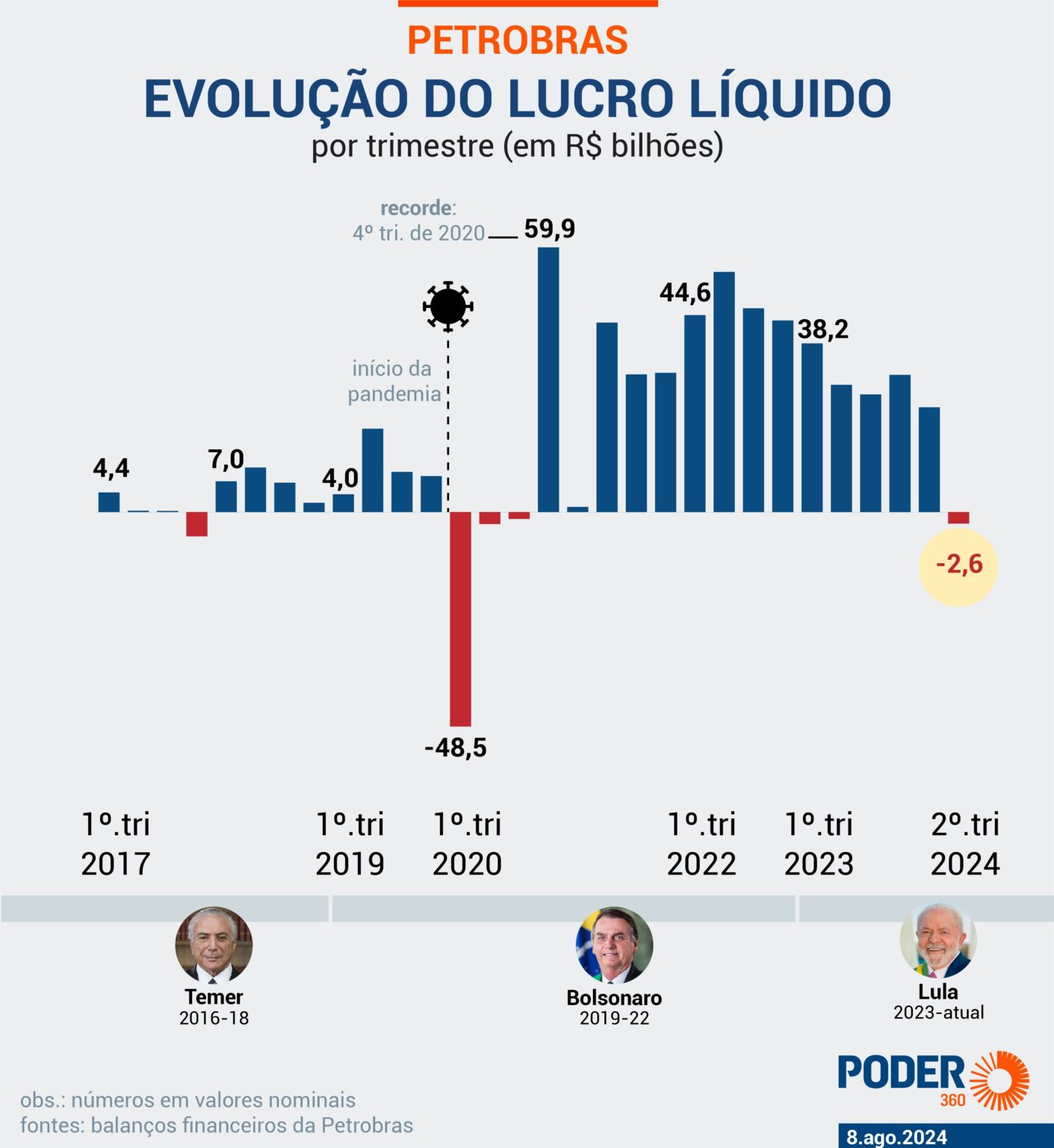 “A Petrobras manteve uma forte geração de caixa no segundo trimestre de 2024, que permitiu realizar US$ 3 bilhões em investimentos, cumprir nossa política de remuneração aos acionistas e pagar dividendos. O resultado líquido do trimestre deve ser analisado à luz de eventos que impactaram o resultado contábil, mas sem impacto relevante no caixa da empresa”, disse.