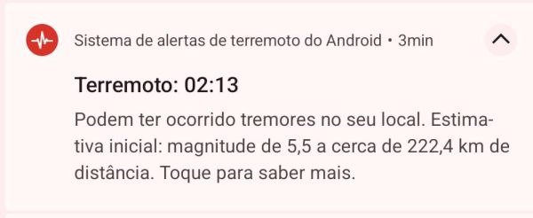 A magnitude do terremoto, conforme informado no alerta, variava entre 4,2 e 5,5. O aviso foi enviado por volta das 2h20 da madrugada.