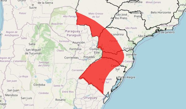 A previsão aponta chuva superior a 60 mm/h ou maior que 100 mm/dia para essas regiões. Também são esperados ventos superiores a 100 km/h e queda de granizo.