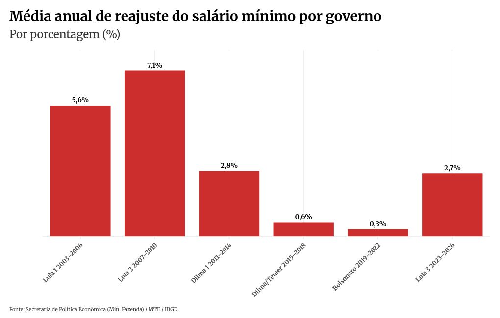 Segundo o estudo, ao comparar janeiro de 2022 com janeiro de 2026, o ganho real acumulado do salário mínimo aumentou, chegando a 11,8% acima da inflação após a retomada da diretriz no início do terceiro mandato de Lula. A medida havia sido interrompida entre 2019 e 2022, durante o governo do ex-presidente Jair Bolsonaro (PL).