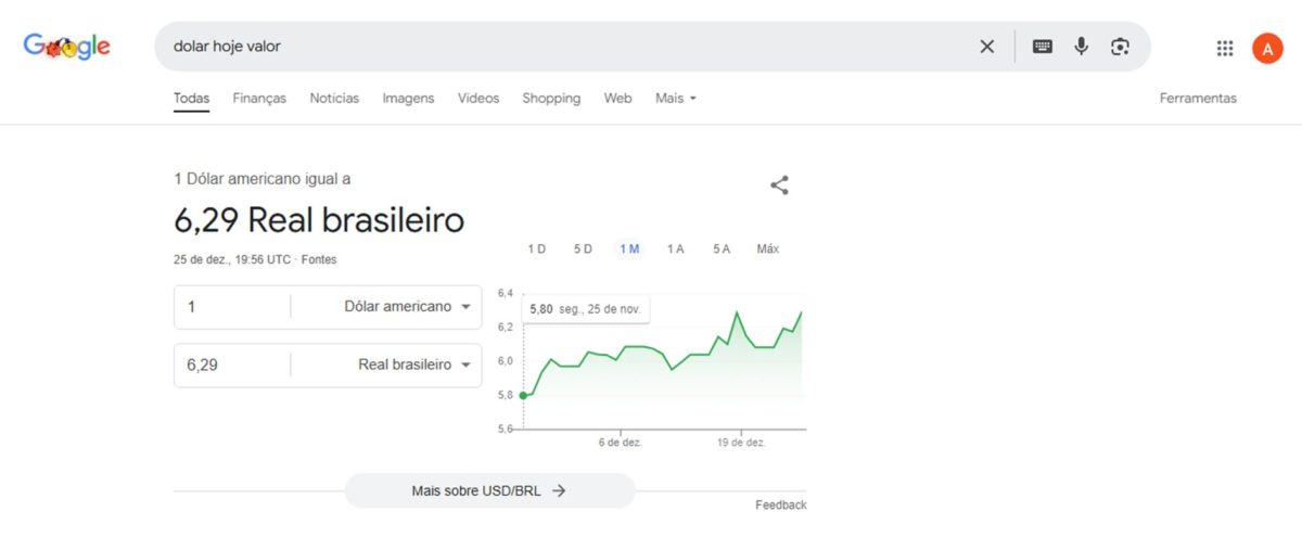 Ao pesquisar sobre o dólar na plataforma, a moeda aparecia cotada a R$ 6,29. Só que, no momento, o mercado de compra e venda de dólares está fechado devido às festividades natalinas.