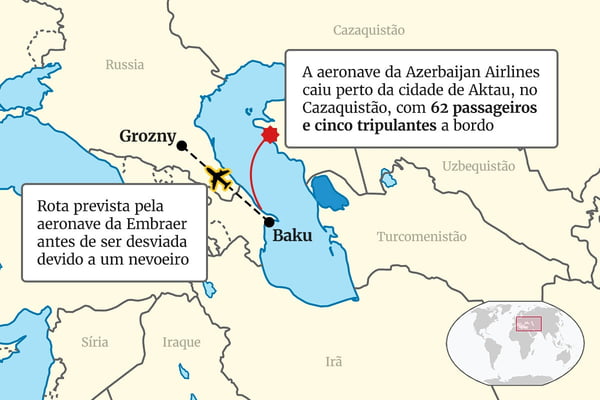 “Um avião que fazia a rota Baku-Grozny caiu perto da cidade de Aktau. Pertence à Azerbaijan Airlines”, informou o Ministério dos Transportes do Cazaquistão no Telegram.