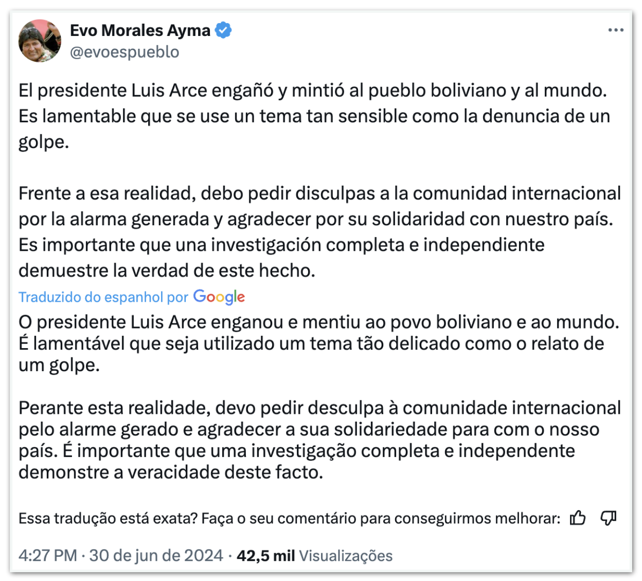 Em seu perfil no X (ex-Twitter), Morales pediu que seja feita uma devassa “completa e autónomo” para afinar a ensaio de corte de Condição, anunciada por Arce na 4ª feira (26.jun). “É lastimoso que seja utilizado uno matéria em tal grau suave uma vez que o resenha de uno corte”, afirmou.