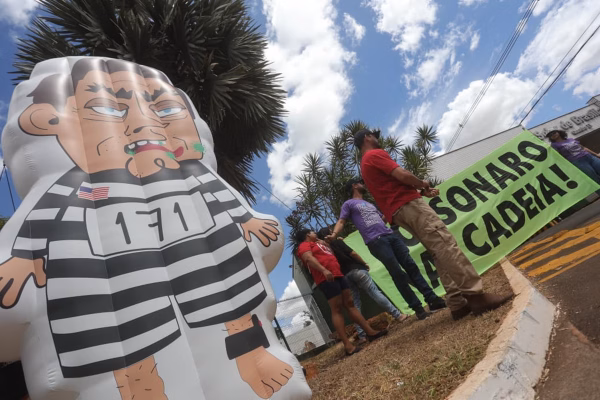 Em frente à casa do ex-presidente Jair Bolsonaro (PL), nesta terça-feira (2/9), manifestantes inflaram um boneco vestido de presidiário e com tornozeleira eletrônica.