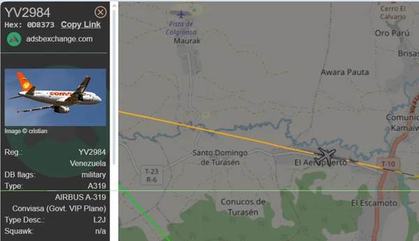 O avião é um Airbus A319-133, registrado como de propriedade do governo da Venezuela, sob matrícula YV2984. Ele pousou em Santa Helena de Uairén por volta das 21h10, no horário local, permanecendo por cerca de 40min no aeroporto. A cidade fica a cerca de 250 km de Pacaraima (RR), no Brasil, numa distância que pode ser percorrida em aproximadamente 3h de carro.