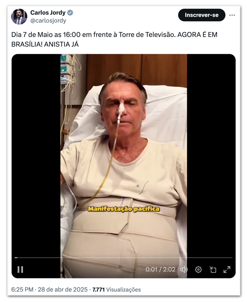 O ex-presidente Jair Bolsonaro (PL) convocou nesta 2ª feira (28.abr.2025) um ato em defesa da anistia dos presos pelos atos do 8 de Janeiro. A manifestação está marcada para 7 de maio, em Brasília, com concentração prevista às 16h na Torre de TV.