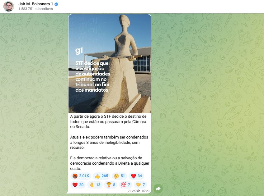 O ex-presidente Jair Bolsonaro (PL) criticou, em seu canal no Telegram, a recente decisão do STF de manter na Corte investigação de autoridades, mesmo após o fim do mandato delas.