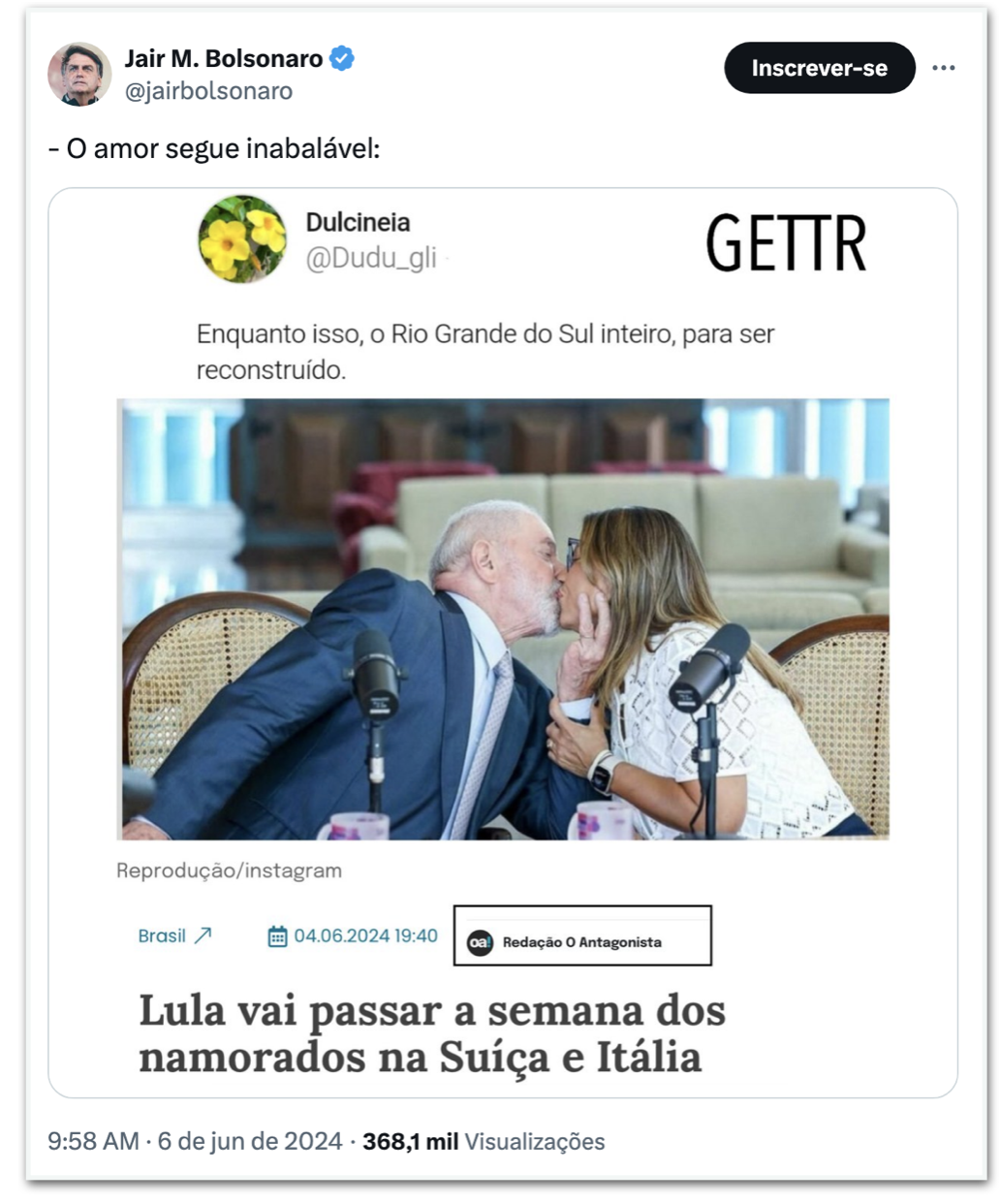 O ex-presidente Jair Bolsonaro (PL) criticou as viagens que o presidente Luiz Inácio Lula da Silva (PT) e a primeira-dama Janja Lula da Silva farão à Itália e Suíça em 14 de junho, na semana do Dia dos Namorados, que cai em uma quarta-feira, 12 de junho. “O amor segue inabalável”, escreveu Bolsonaro em suas redes sociais nesta quinta-feira (6 de junho de 2024).