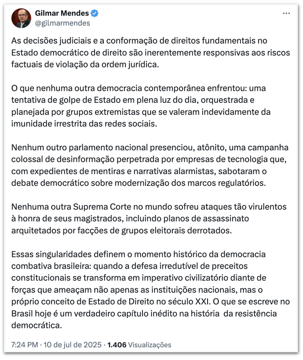 O ministro do STF (Supremo Tribunal Federal) Gilmar Mendes declarou nesta 5ª feira (10.jul.2025) que “o que se escreve no Brasil hoje é um verdadeiro capítulo inédito na história da resistência democrática”. O magistrado se manifestou por meio de uma publicação em seu perfil no X. Apesar de não citar o presidente dos Estados Unidos, Donald Trump (Partido Republicano), a declaração se deu 1 dia depois de o republicano anunciar tarifa de 50% sobre os produtos do Brasil.