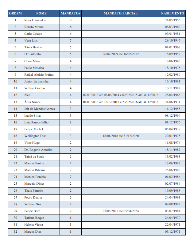 Pelas regras, quem sai na frente é Rosa Fernandes (PSD), decana da Casa, em seu nono mandato consecutivo, sendo a vereadora mais longeva da história do Legislativo carioca. Na outra ponta da fila aparece a novata Alana Passos (PL), que assumiu a cadeira em dezembro de 2025 após a renúncia de Carlos Bolsonaro (PL).