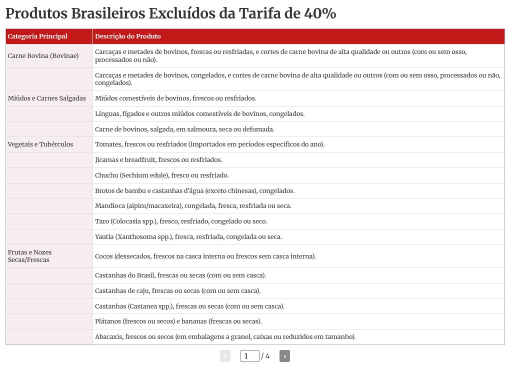 Com a decisão desta quinta, as tarifas adicionais de 40% sobre carne bovina fresca, resfriada ou congelada, produtos de cacau e café, certas frutas, vegetais e nozes, e fertilizantes foram zerados.