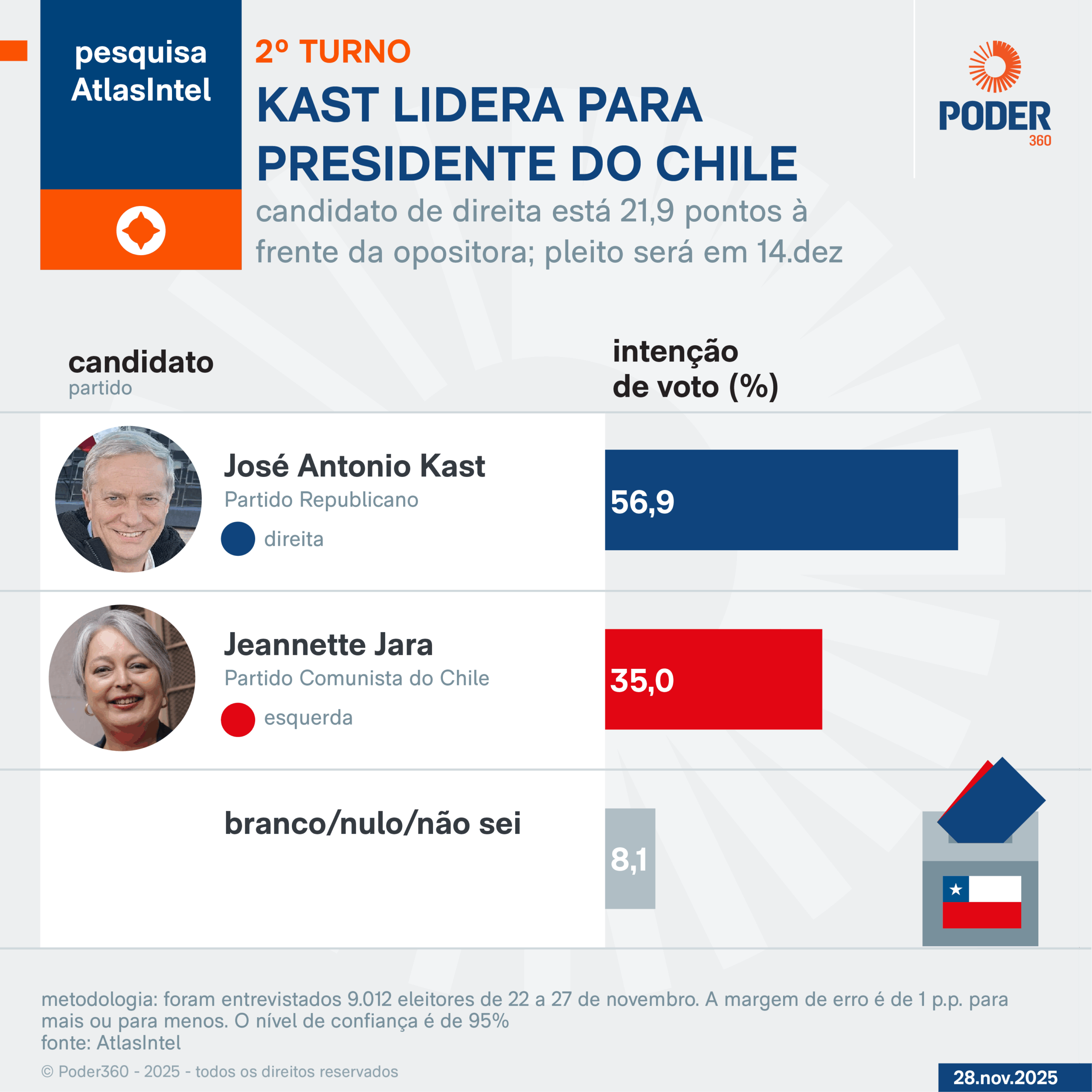 O pleito se dá diante de um cenário de incerteza política e econômica no qual a ex-ministra o Trabalho Jeannette Jara (Partido Comunista), aliada de Boric, liderou o 1º turno obtendo 26,8% dos votos válidos, mas aparece atrás de José Antonio Kast (Partido Republicano) que registrou uma vantagem de 21,9 p.p. ante Jara, segundo pesquisa AtlasIntel.