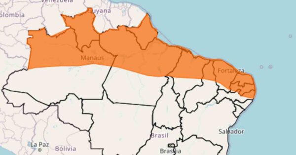 - O Inmet emitiu um alerta laranja de chuvas intensas e ventos intensos para faixa norte das regiões Norte e Nordeste.