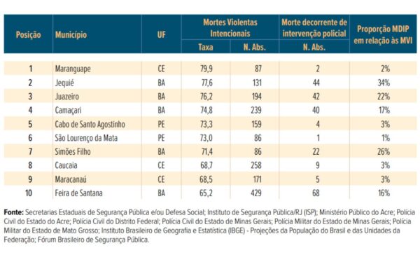 Tabela com cidades mais violentas do país em 2024