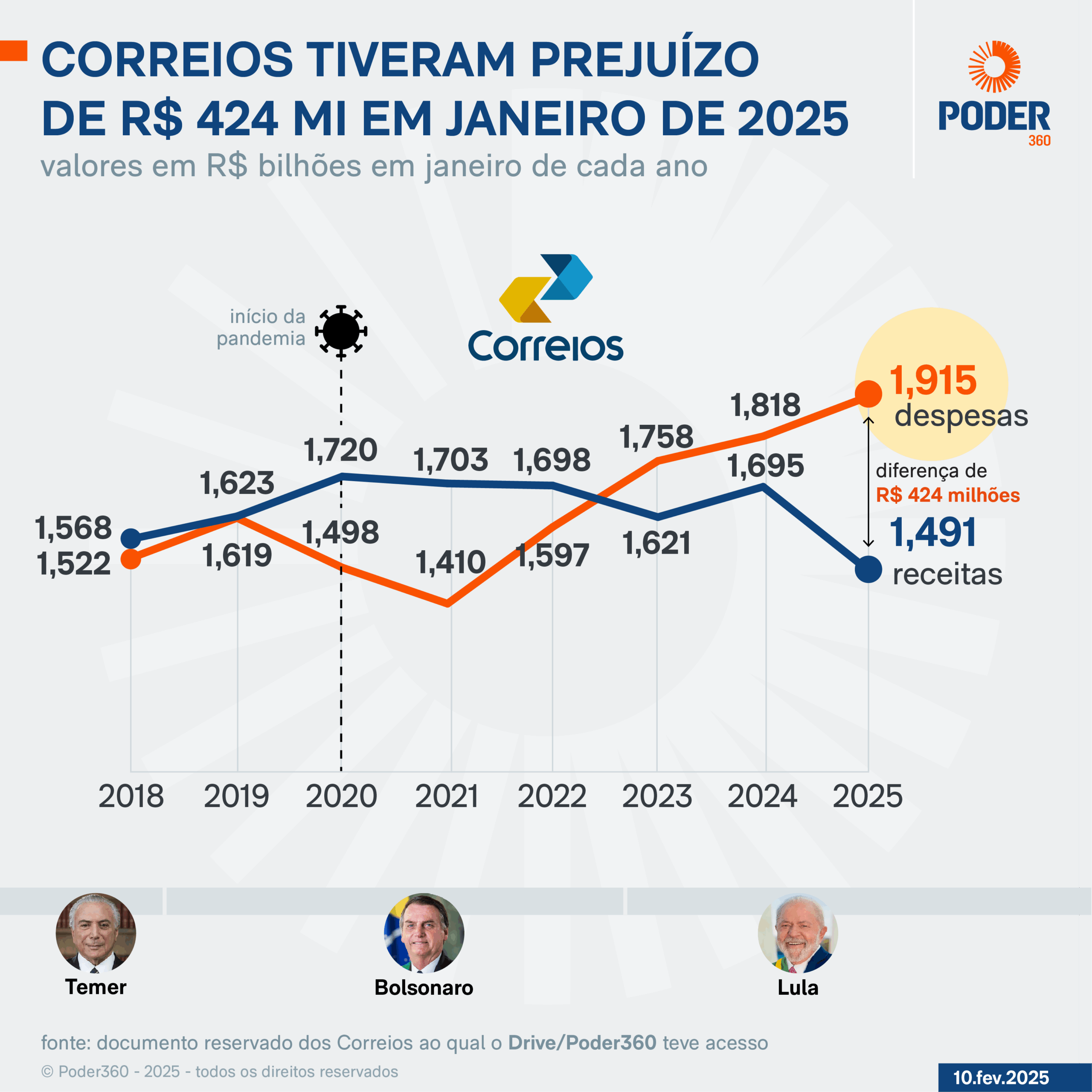 Em janeiro de 2025, a estatal registrou um prejuízo de R$ 424 milhões –o maior para o mês na história dos Correios.