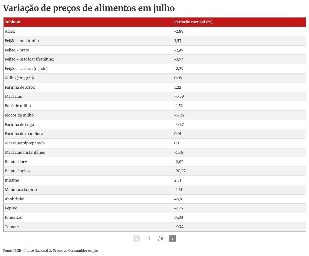 Dos 160 subitens analisados em alimentação no domicílio, quase metade (78 produtos alimentícios) registrou queda na passagem de junho para julho. Outros 80 aumentaram e, apenas, dois tiveram estabilidade no período.