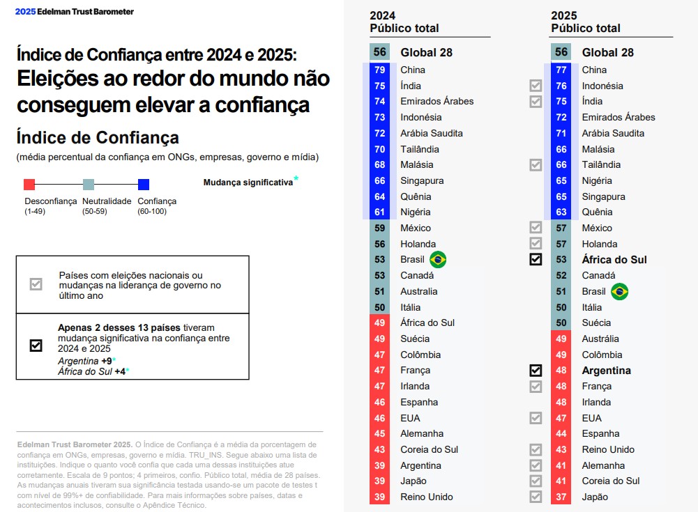Uma pesquisa da Edelman Trust Barometer mostra que, em 2025, a confiança da população brasileira em instituições como empresas, governos, mídia e ONGs caiu para 51%, em comparação com 53% em 2024. O Brasil, que ocupava a 14ª posição, em um ranking de 28 países, agora está em 15º lugar.