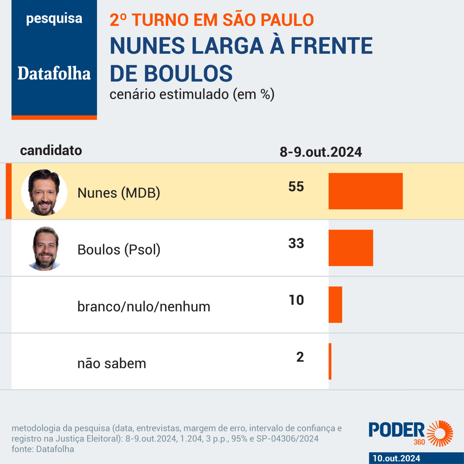 Pesquisa Datafolha divulgada na 5ª feira (10.out.2024) mostra que Ricardo Nunes venceria Guilherme Boulos na disputa de 2º turno pela Prefeitura de São Paulo por 55% a 33%. O embate direto entre os 2 foi definido no domingo, 6 de outubro.
