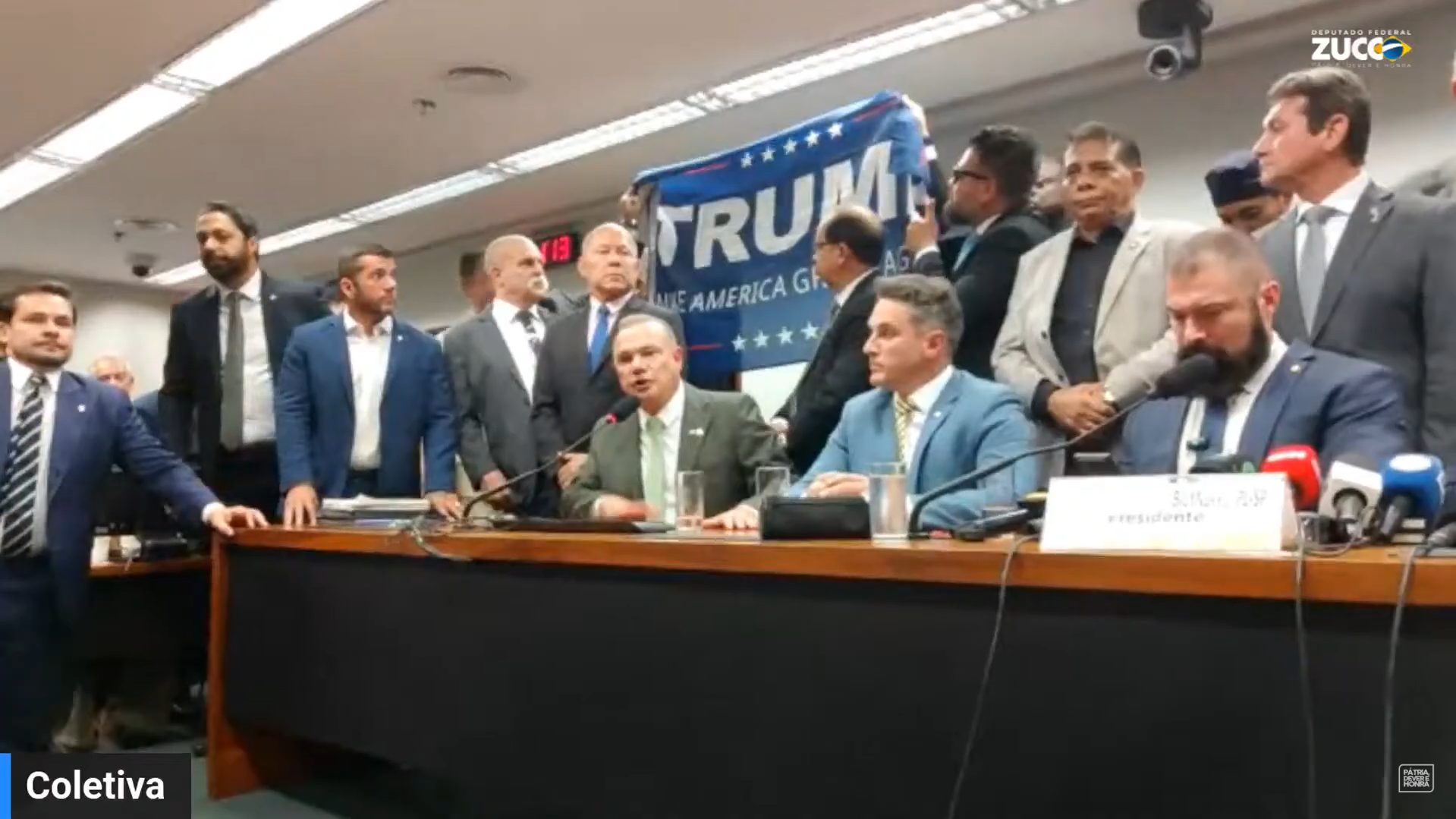 Durante uma coletiva de imprensa realizada nesta terça-feira, 22, um momento incomum ocorreu quando o deputado Delegado Caveira (PL-PA) exibiu uma bandeira com o nome do presidente dos Estados Unidos, Donald Trump.