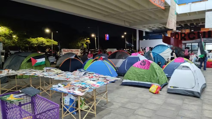 Imagens que circulam nas redes sociais mostram um homem sendo expulso de um acampamento pró-Palestina na Faculdade de Filosofia, Letras e Ciências Humanas (FFLCH) da Universidade de São Paulo.
