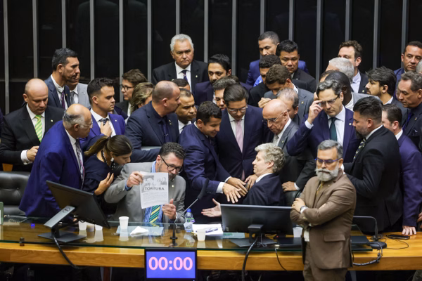 Bolsonaristas bloqueiam cadeira de Hugo Motta ao pedir anistia