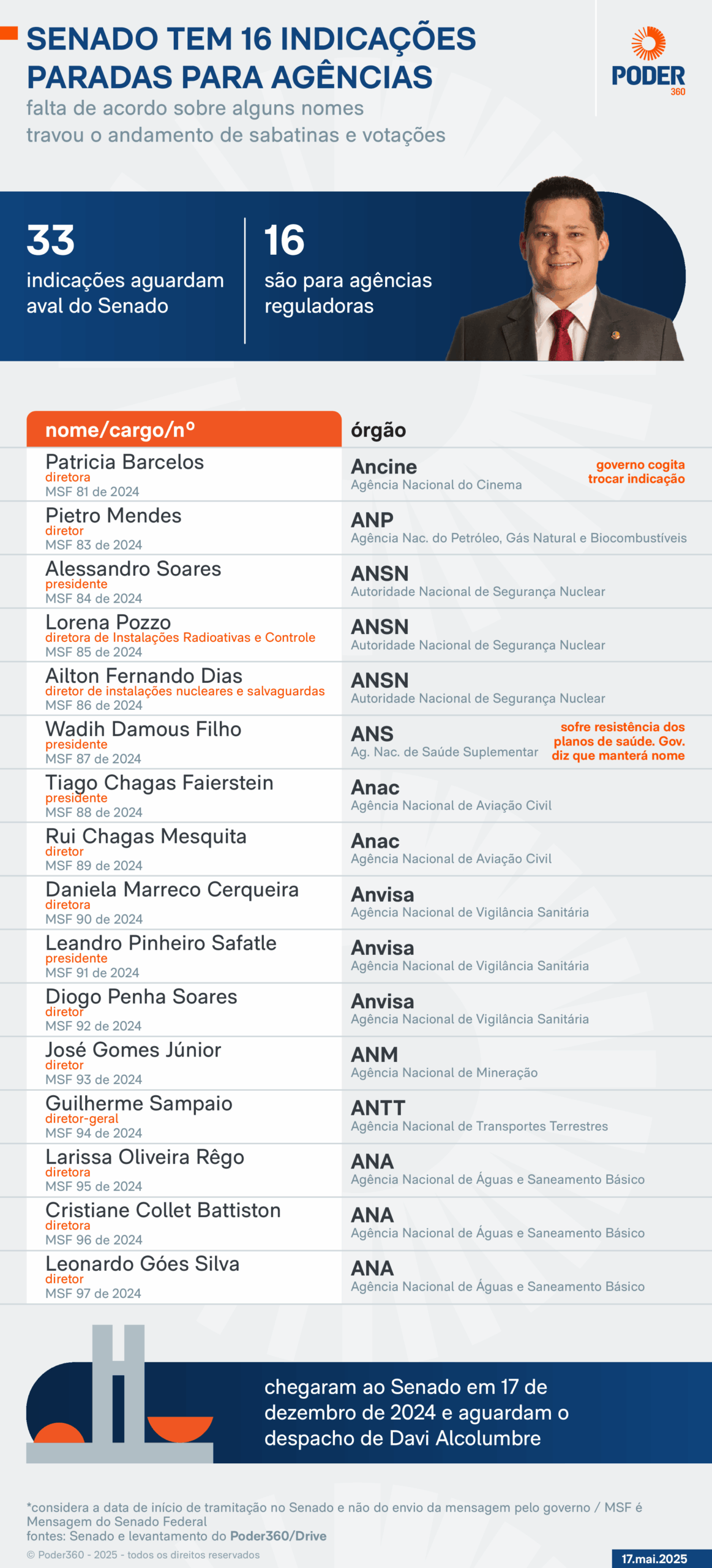 Segundo o levantamento do Poder360, 33 nomes aguardam análise: além dos 16 para agências reguladoras, há outras 15 indicações para cargos de embaixador e duas para o Conselho Nacional do Ministério Público.