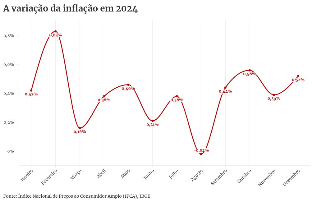Em 2024, itens muito presentes na mesa do brasileiro, como o café e a laranja, tiveram aumento considerável de preços. Nesta sexta-feira (10/1), o Instituto Brasileiro de Geografia e Estatística (IBGE) divulgou que a inflação oficial de 2024 — medida pelo Índice Nacional de Preços ao Consumidor Amplo (IPCA) — ficou em 4,83% no ano, acima da meta estipulada (que era de 3%).