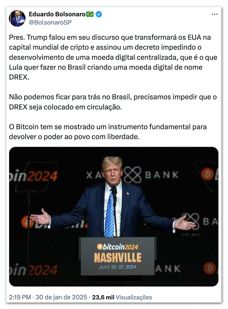 Na tarde desta 5ª feira (30.jan.2025), Eduardo Bolsonaro escreveu na sua conta no X (ex-Twitter) sobre o discurso do republicano que promete “transformar os EUA na capital mundial de cripto”. O decreto assinado impede a concorrência direta com criptomoedas já existentes.