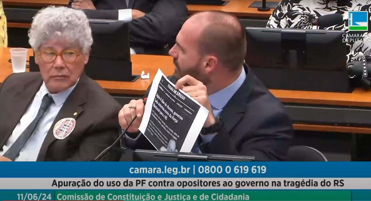 Além disso, o parlamentar questionou a legalidade das ações do governo em relação à sua pessoa por compartilhar uma matéria da Folha de São Paulo. Ele afirmou que foi injustamente denunciado ao STF: “Eu pergunto ao senhor, onde está a fake news? Após quatro dias de chuva, governo Lula autoriza envio da Força Nacional para o Rio Grande do Sul”, disse Eduardo exibindo uma reportagem da Folha de SP.