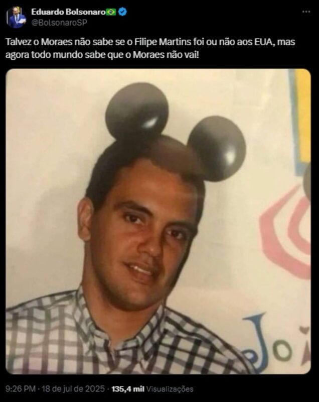 No post, Eduardo compartilhou uma foto de Moraes com orelhas do personagem Mickey Mouse, da Disney. A imagem foi publicada depois de o secretário de Estado norte-americano, Marco Rubio, confirmar que o governo dos EUA revogou, com efeito imediato, o visto do ministro.