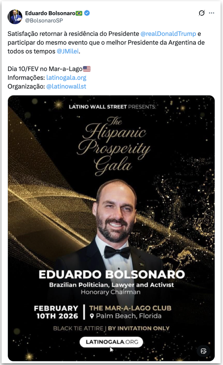 O ex-deputado federal Eduardo Bolsonaro (PL-SP) participará do Hispanic Prosperity Gala (Gala da Prosperidade Hispânica) com o presidente dos Estados Unidos, Donald Trump (Partido Republicano), e o presidente da Argentina, Javier Milei (A Liberdade Avança, direita). O encontro acontecerá na 2ª feira no Mar-a-Lago Club, resort de propriedade de Trump na Flórida.