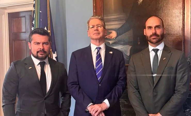 O deputado federal Eduardo Bolsonaro (PL-SP) se encontrou com o secretário do Tesouro dos Estados Unidos, Scott Bessent, na última quarta-feira (13). A reunião, que também contou com a presença do blogueiro bolsonarista Paulo Figueiredo, se deu exatamente na data em que o funcionário de alto escalão dos EUA tinha agendado uma negociação do tarifaço com o ministro da Fazenda, Fernando Haddad. O encontro com o auxiliar de Lula foi desmarcado dois dias antes.