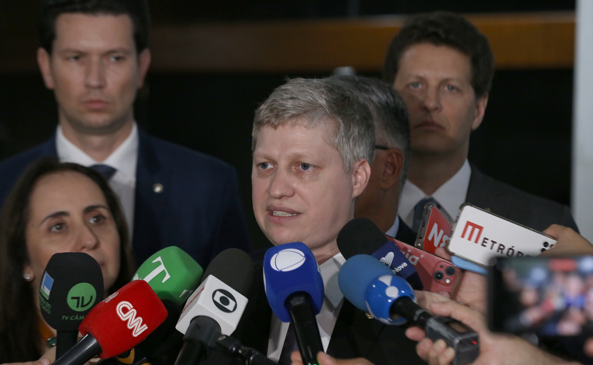 O senador Eduardo Girão concorreu à presidência do Senado Federal, mas foi derrotado pelo favorito na disputa, o senador Davi Alcolumbre (União-AP). Na coletiva, Girão afirmou que o Congresso Nacional precisa estar próximo da população. “Está completamente apartado do povo”, disse. “No Senado, fomos coerentes e mostramos os equívocos, mas a soberania é dos colegas que votam.”