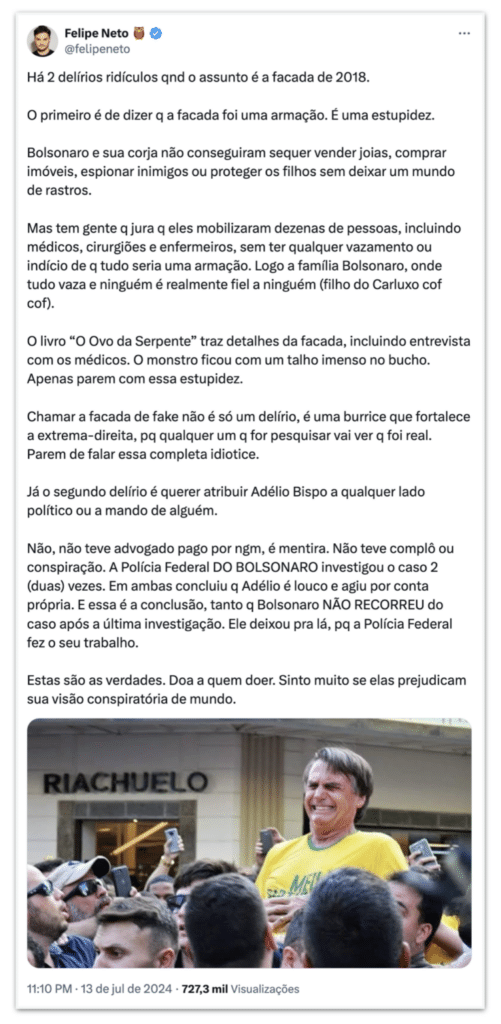 Na noite do derradeiro sábado (13/7), singular tweet inimaginável de Felipe Neto chamou educação velo teor. Em sua operação no X, o influenciador do dedo falou a apreço dos boatos que continuam a precingir o atentado sofrido por Jair Bolsonaro em 2018. Adélio Prelado de Oliveira esfaqueou o portanto candidato à presidência durante singular compromisso de campanha.