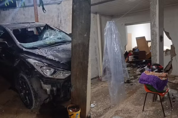 Uma das paredes foi destruída com o impacto, e a parte dianteira do veículo ficou completamente danificada.