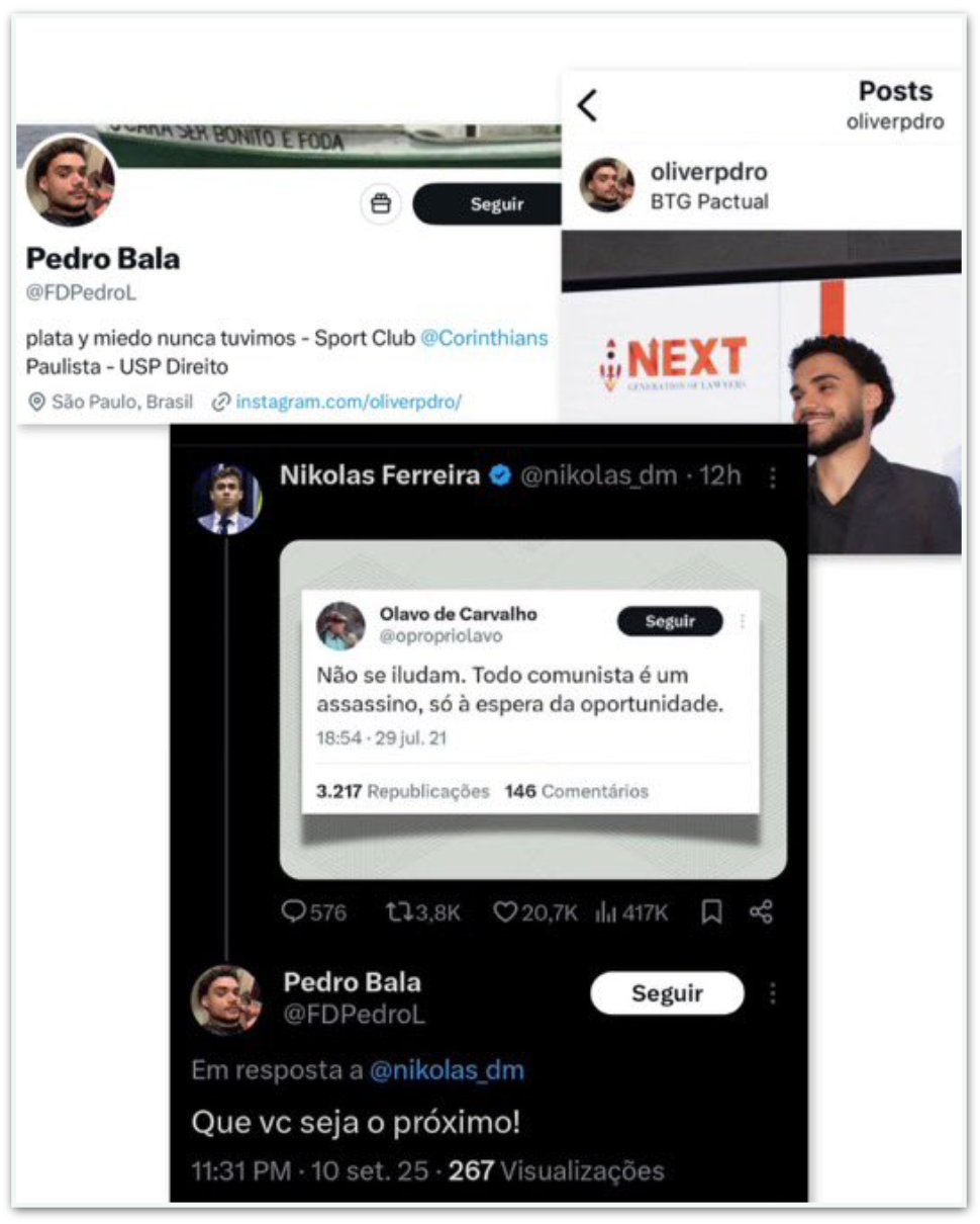 O estudante de direito Pedro Bala foi demitido nesta 5ª feira (11.set.2025) da empresa em que trabalhava, a Next Generation of Lawyers, depois de publicar nas redes sociais uma mensagem em tom de ameaça em que indica torcer pela morte do deputado federal Nikolas Ferreira (PL-MG).