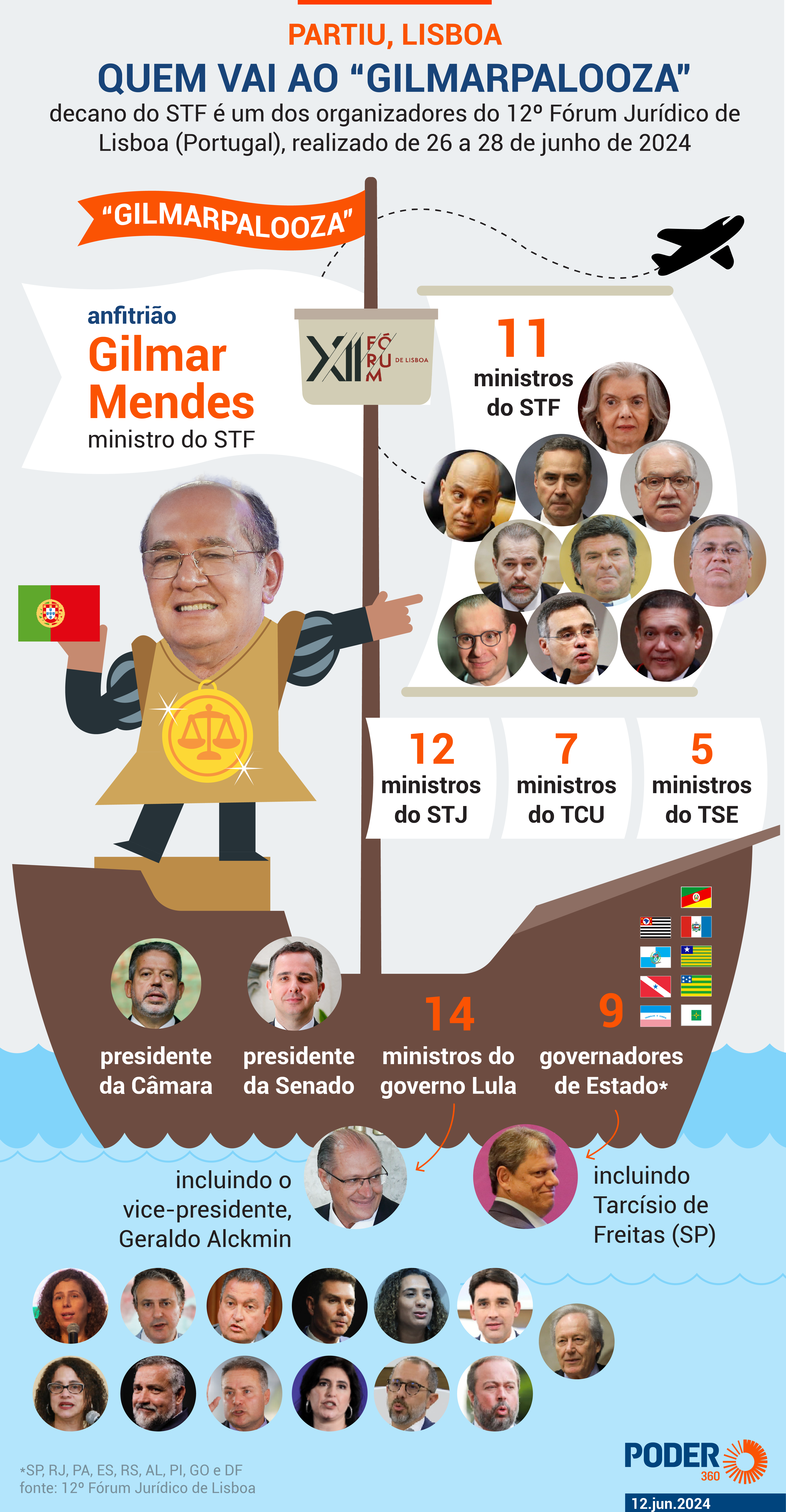 Gilmar é o decano do STF (ministro que está há mais tempo no cargo) e é um dos organizadores do evento lisboeta. Além dos 11 do Supremo, o fórum também deve contar com 12 dos 33 ministros do Superior Tribunal de Justiça, 5 dos 7 ministros do Tribunal Superior Eleitoral, 14 dos 39 ministros de Estado do governo do presidente Luiz Inácio Lula da Silva (incluindo o vice-presidente do Brasil, Geraldo Alckmin, que acumula o comando da Indústria e Comércio), 9 dos 27 governadores de Estado e os presidentes da Câmara, Arthur Lira (PP-AL), e do Senado, Rodrigo Pacheco (PSD-MG).