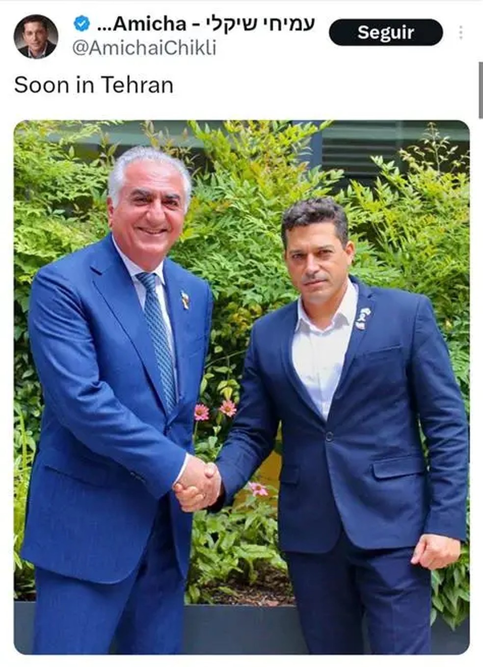 Na última sexta-feira, o ministro israelense de Assuntos da Diáspora, Amichai Chikli, compartilhou uma foto com Reza Pahlavi: “o Irã é seu”, escreveu na legenda. “O regime está fraco e dividido. Pode cair. Como eu disse aos meus compatriotas: o Irã é seu e vocês devem reconquistá-lo. Estou com vocês. Mantenham-se fortes e venceremos”, acrescentou Chikli.