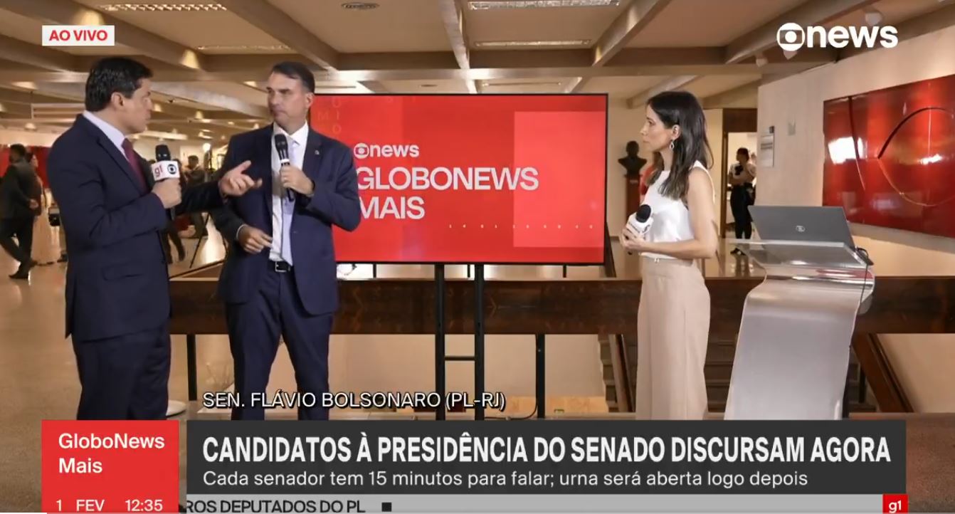 O Senado Flávio Bolsonaro concedeu breve entrevista à Globo News sobre a eleição de David Alcolumbre para a presidência.