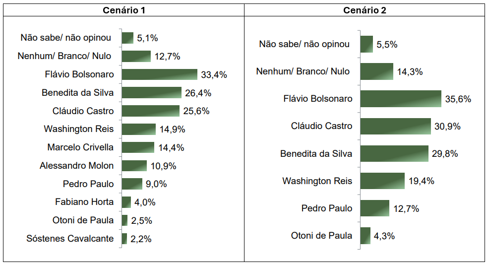 Flávio Bolsonaro lidera nos dois cenários traçados pela pesquisa. No cenário um, ele tem 33,4% das intenções, e no segundo, 35,6%. Na primeira simulação, aparecem, em seguida, Benedita da Silva (PT) com 26,4%; o governador Cláudio Castro (PL) com 25,6%; Washington Reis (MDB) soma 14,9% e Marcelo Crivella (Republicanos), 14,4%.