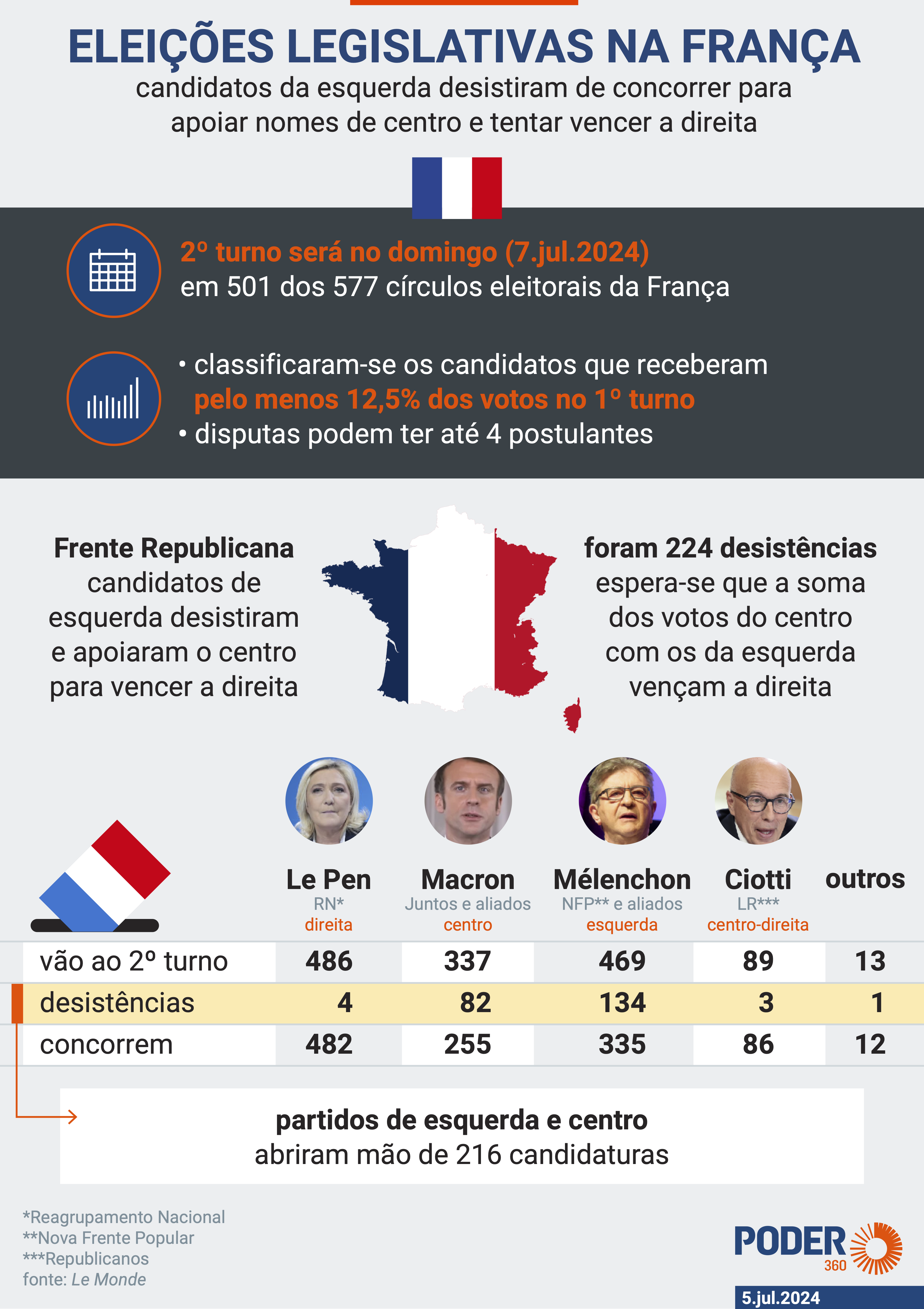 Lá disso, na França, para que qualquer candidato ao Assembleia seja designado no 1º vez é precípuo entender lã menos 50% + 1 dos votos. Isolado 76 candidatos conseguiram sobrecarregar essa baliza em 2024. Os outros 501 serão definidos neste domingo (7.jul).
