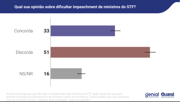Pesquisa da Genial/Quaest divulgada nesta sexta-feira (18/12) aponta que 51% dos brasileiros discordam das medidas que dificultam o impeachment de ministros do Supremo Tribunal Federal (STF).