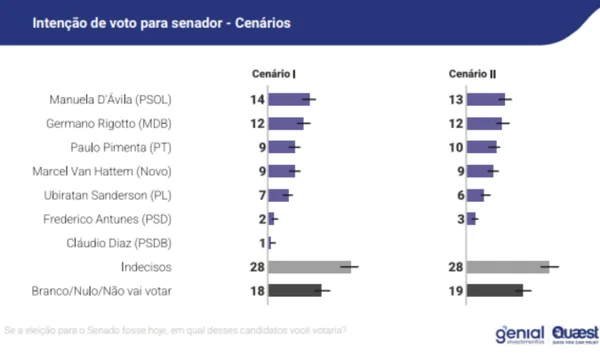 Para o Senado, Manuela D’Ávila (PSol-RS) tem 14% ou 13%, dependendo do cenário, seguida por Germano Rigotto (MDB-RS) com 12%, Paulo Pimenta (PT-RS) e Marcel Van Hattem (Novo-RS).