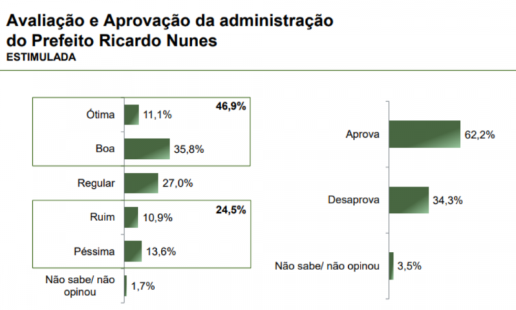 Pensando na aprovação da gestão do prefeito de São Paulo, Ricardo Nunes, 11,1% dos eleitores consideraram sua administração como ótima, enquanto 35,8% a classificaram como boa. Além disso, outros 27% avaliaram a atuação de Ricardo como regular, 10,9% como ruim, e 13,6% como péssima.