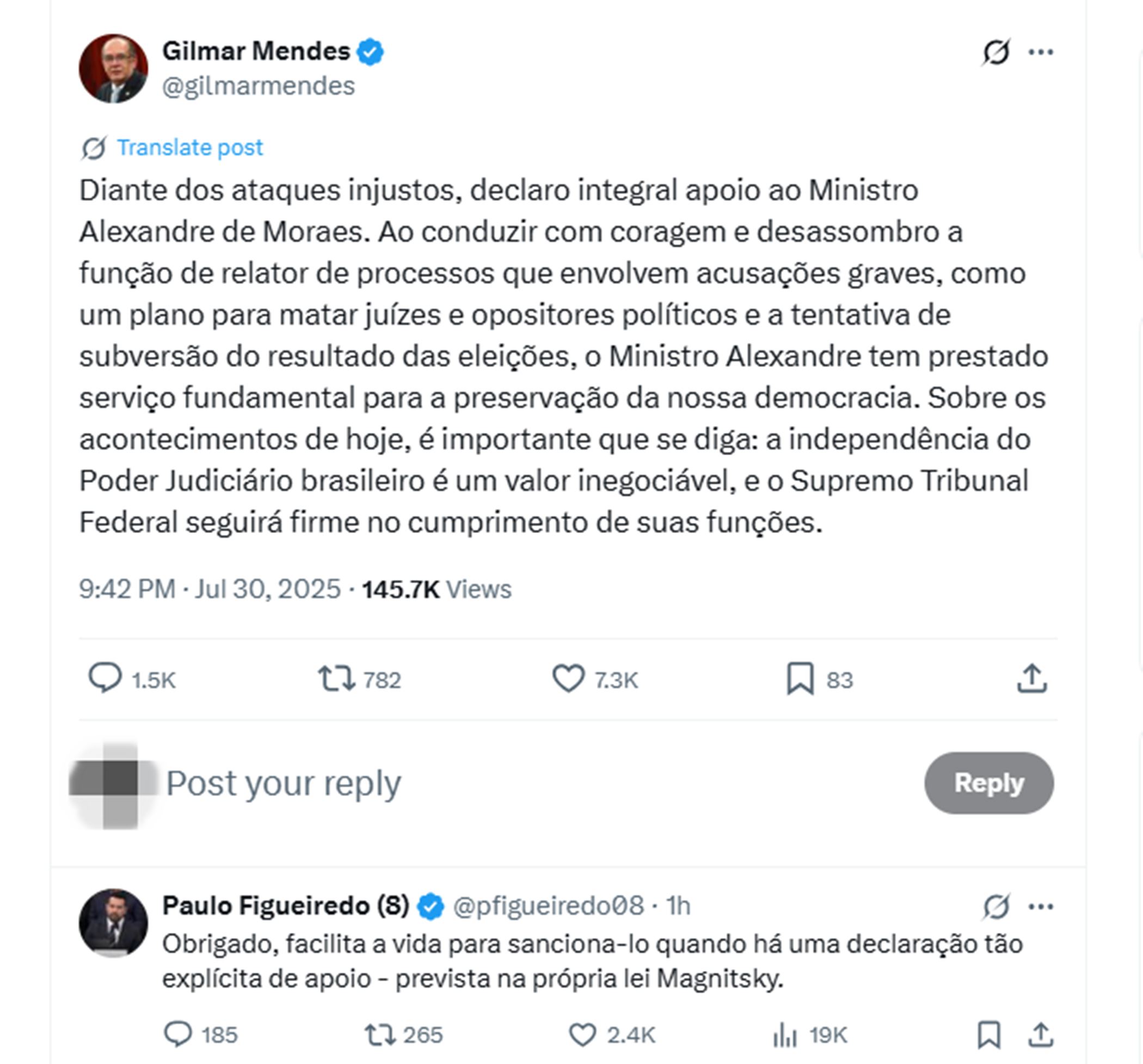 Em resposta a Gilmar Mendes, Paulo Figueiredo retrucou dizendo, em tom de ameaça, que a manifestação do ministro facilitaria a possibilidade de sancioná-lo também, assim como ocorreu com Moraes. “Obrigado, facilita a vida para sancioná-lo quando há uma declaração tão explícita de apoio – prevista na própria lei Magnitsky”, escreveu Figueiredo