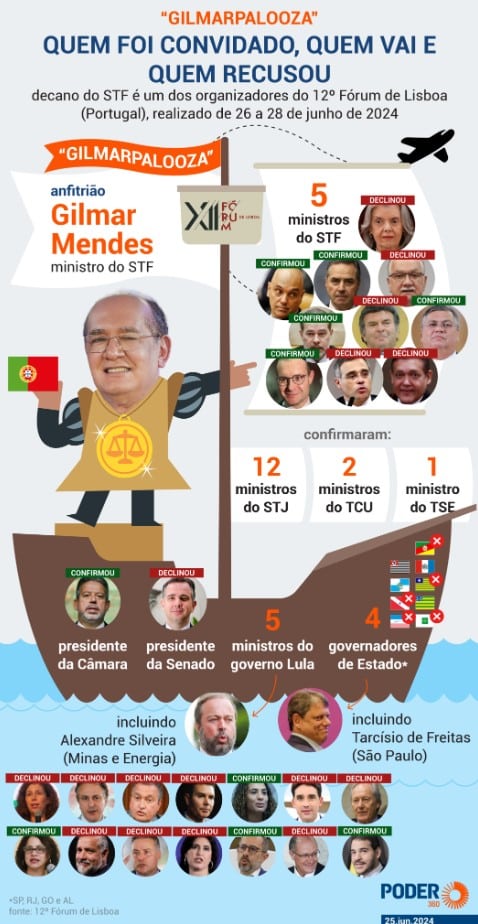 O “12º Fórum de Lisboa”, consertado lã ministro do Sumo Judicatura Federalista, Gilmar Mendes, em Portugal, tem sinceridade nesta quarta-feira, 26 de junho de 2024. O ocorrência já se tornou uma tradição e recebeu o sobrenome de “Gilmarpalooza” – uma entendimento dos nomes do decano e do conhecido festival de cantiga Lollapalooza, originado em Chicago (EUA), cuja interpretação brasileira ocorre anualmente em São Paulo, com diversas bandas de diferentes lugares.
