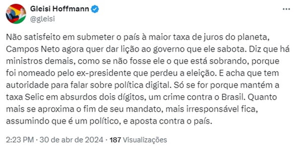 Em seguida, a presidente do PT afirmou que Campos Neto “mantém a taxa Selic em absurdos dois dígitos” e pratica “um violação contra o Brasil”. “Quanto mais se aproxima o termo de seu procuração, mais irresponsável fica, assumindo que é um político, e aposta contra o país”, concluiu ela.