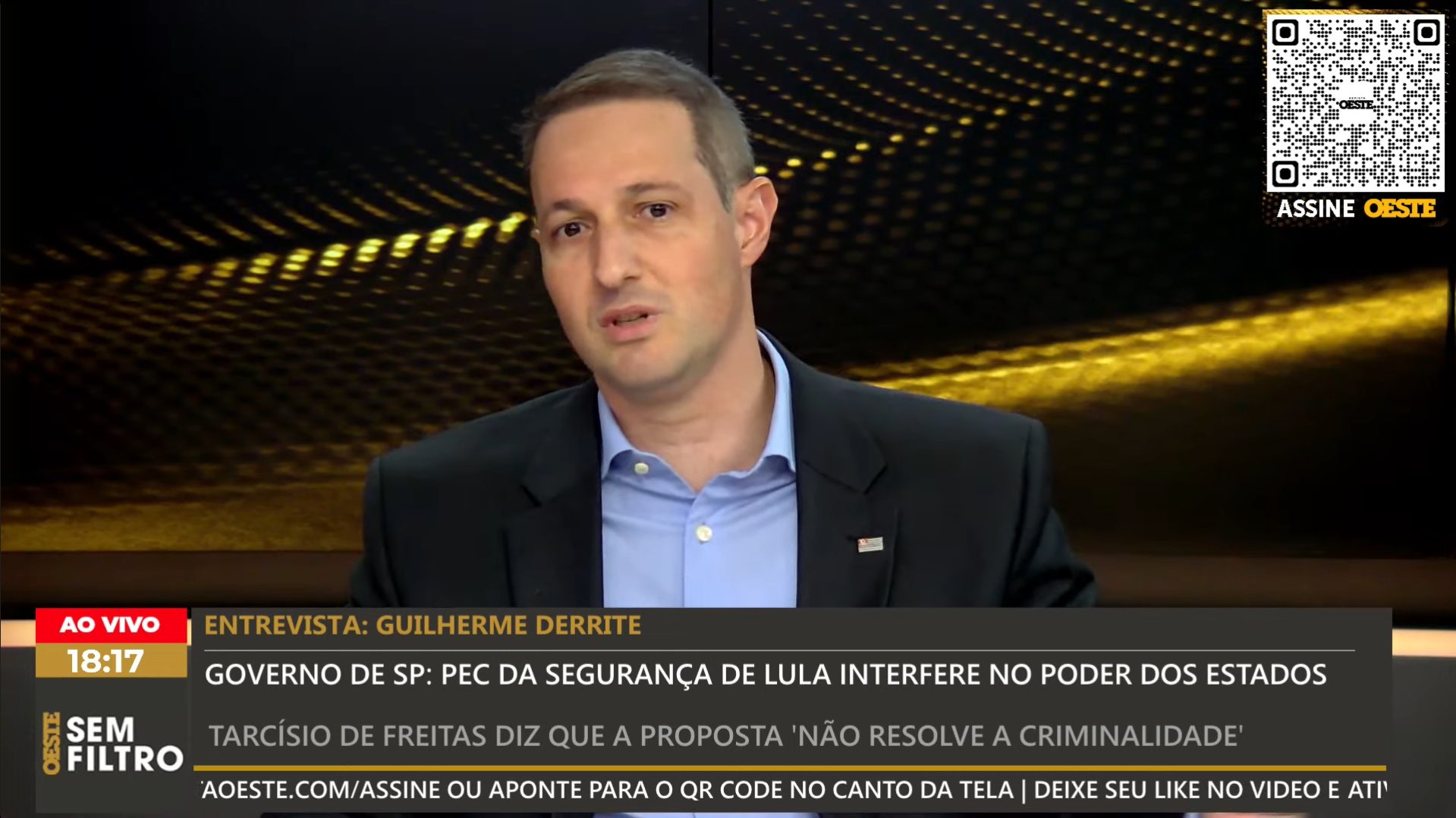 Confira a entrevista completa de Guilherme Derrite ao Oeste Sem Filtro, no canal da Revista Oeste no YouTube. O programa é transmitido ao vivo, de segunda-feira a sexta-feira, a partir das 17h45.